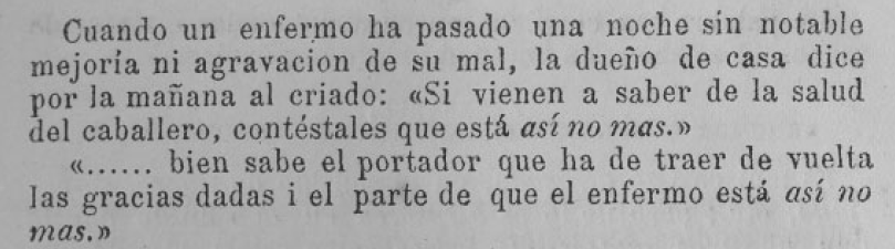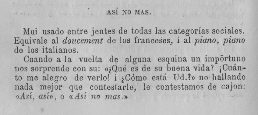 Según la definición entregada por Zorobabel, esta frase era utilizada por todas las categorías sociales y equivalía al italiano “piano, piano” (lentamente, sin apuros). Sin embargo, en los ejemplos que se entregan en el diccionario, corresponde más bien con decir que las cosas no están ni bien ni mal. El texto entrega dos casos: si alguien te pregunta cómo estás y no sabes qué responder, se dice “así no mas”. Si un enfermo no mejora ni empeora, entonces su familia dirá que está “así no mas”.